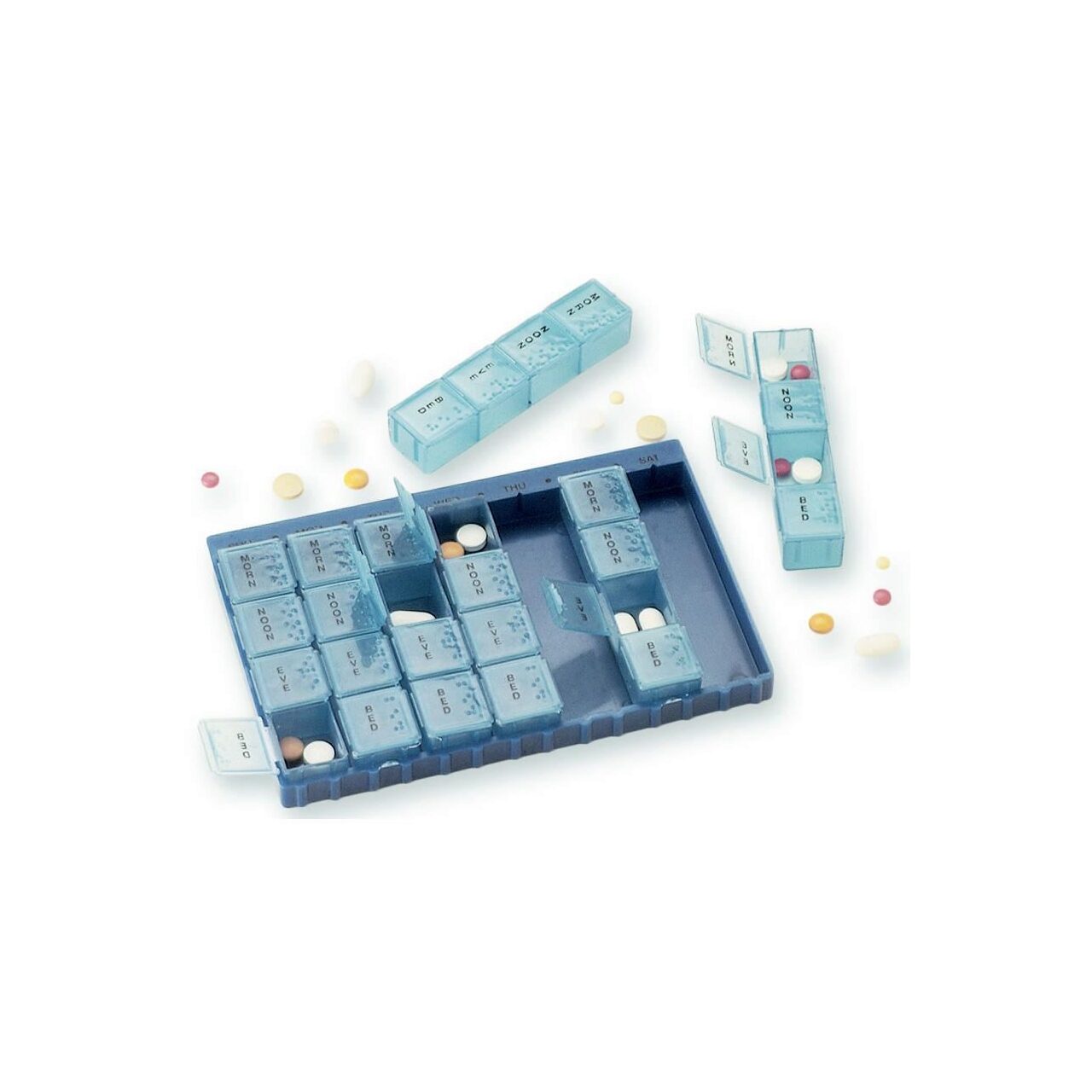 Cu 7 cutii mici detașabile cu 4 compartimente (dimineața, pranz, seara și noapte). O cutie pentru fiecare zi a săptămânii.