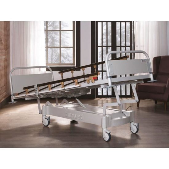Pat pentru pacienti, prevazut cu patru motoare pentru reglarea inaltimii, pozitiei Trendelenburg si anti-Trendelenburg, sectiunilor spate si genunchi, cu capete din panouri de material lemnos si protectii laterale confectionate din aluminiu.