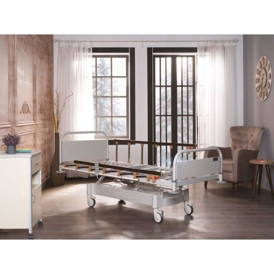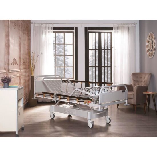 Pat pentru pacienti, prevazut cu trei motoare pentru reglarea inaltimii, sectiunilor spate si genunchi, cu capete din panouri de material lemnos si protectii laterale confectionate din aluminiu.